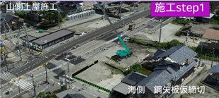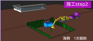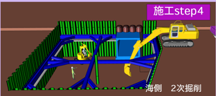 | 海側(上り線側)の土留め仮締切工事が完了後1次掘削を行います。 |