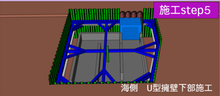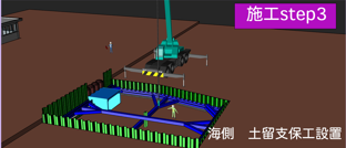 | 海側(上り線側)の土留め鋼矢板が掘削により変位しないように土留支保工を設置します。 |