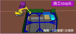 | 完成した部分の外側を土砂により埋戻します。(この後土留め支保工を取り外します。土砂で埋戻す事で鋼矢板の変位を抑えます。) |