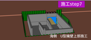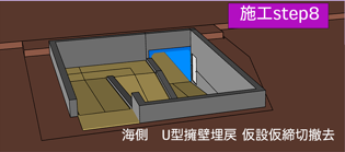 | U型擁壁を埋戻し、土留め仮締切(鋼矢板)を撤去します。U型擁壁の中にスロープを作成し舗装コンクリートで仕上げます。 |